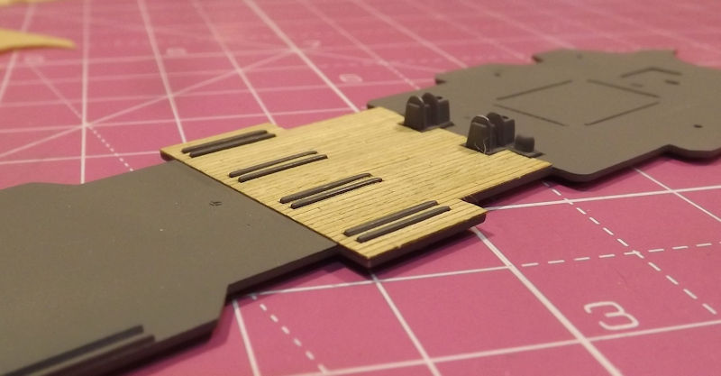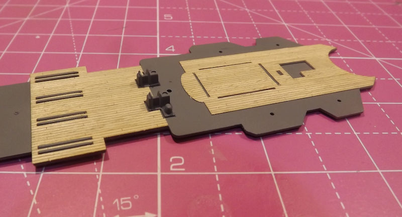 It's time to fit the wooden decks. The backing was removed and the deck carefully lined up before pressing into place.