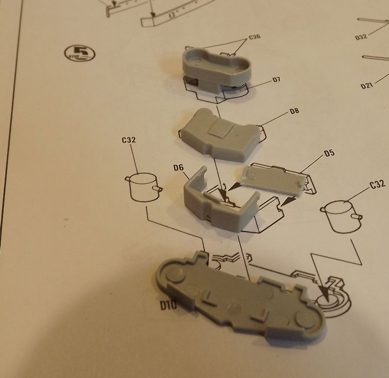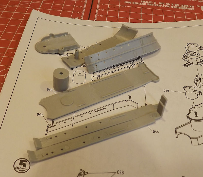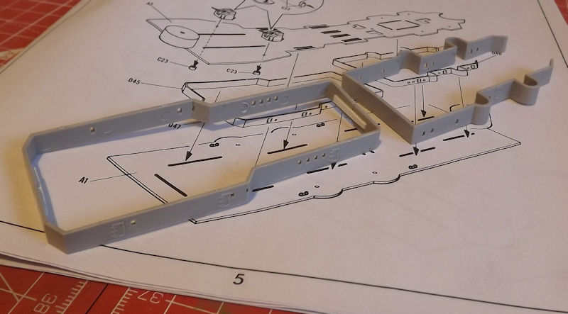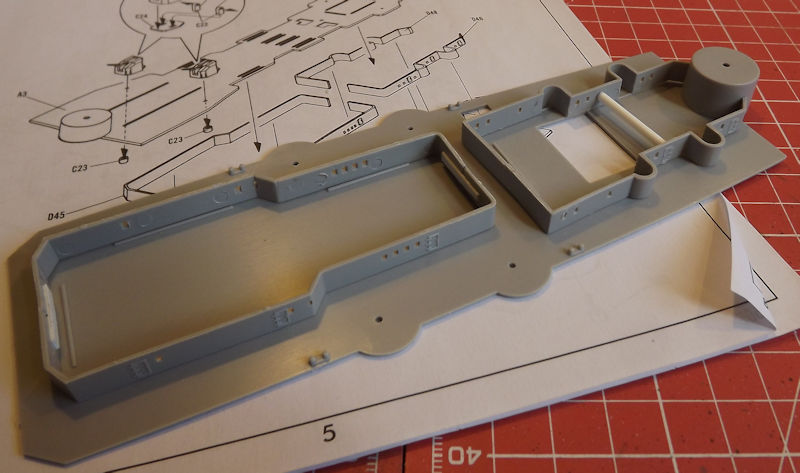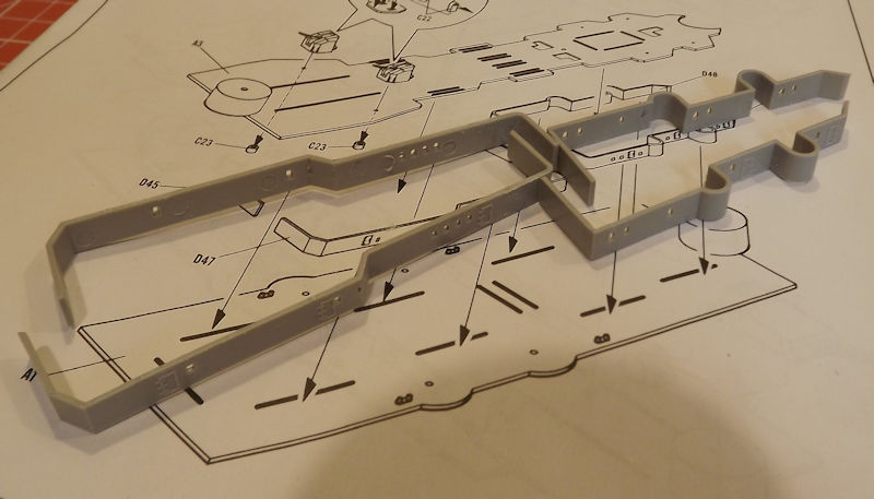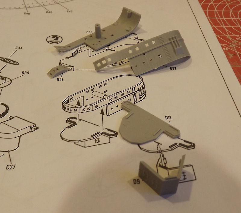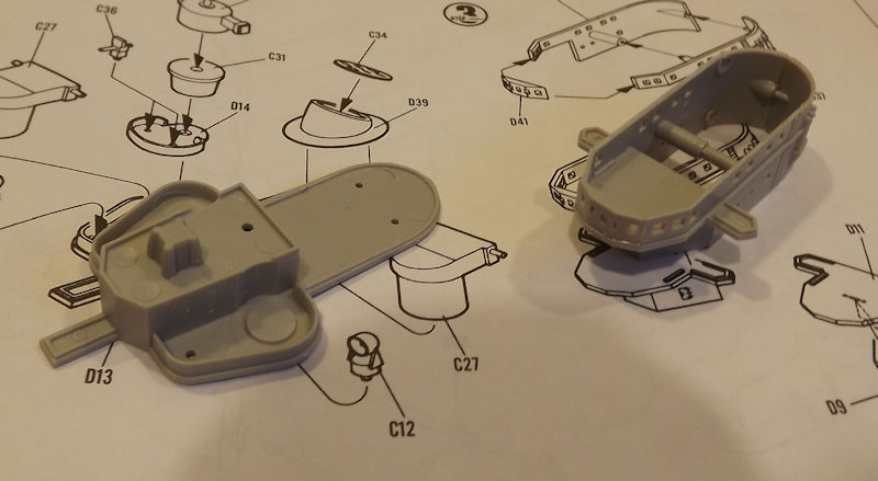 Since the decks and sides are different colours, I am planning in building up a series of sub-assemblies for painting. Step 1 is the attachment of the properllers and rudders to the hull, but I will leave that until later, or they are liable to get in the way. So, I will start by looking at step 2.