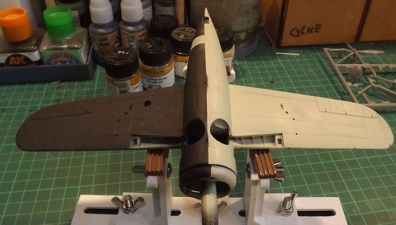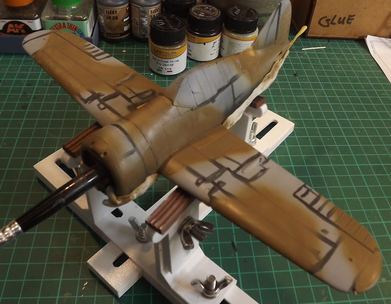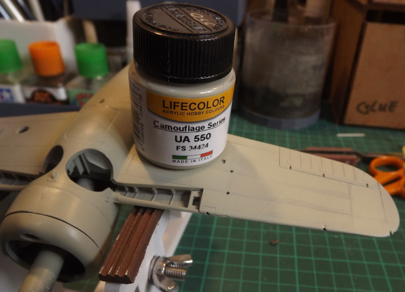 While preparing to spray, I realised that the primer had got into the mechamism and gummed up the needle, so I switched to another airbrush to use. Lifecolor RAF Sky was sprayed onto half of the underside.