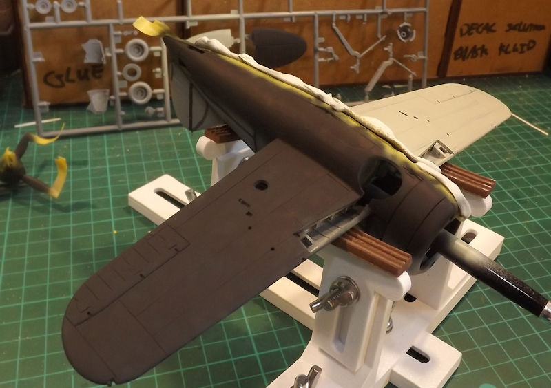 After taking apart my main airbruch for cleaning, the sky was masked and the other half sprayed black. I alsi sprayed the waslkways on the top of the wing. It was about now that I remembered the sky band rouind the rear fuselage. This was sprayed, masked and the black touched up.
